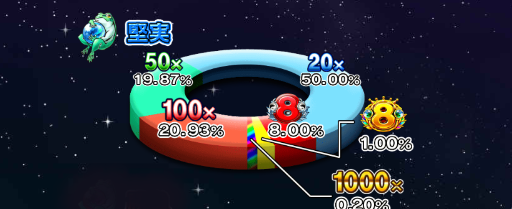 『堅実』の青いカエルは、配当倍率の特典がメインとなっており、最低でも20倍配当で、さらに40%の確率で50倍以上の配当を得られるのが魅力的です。