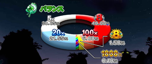 『バランス』の緑色のカエルは、約60%の確率で配当倍率、約40%の確率でラッシュというバランスの取れた抽選内容が特徴です。