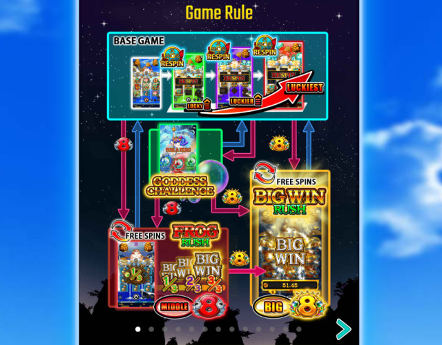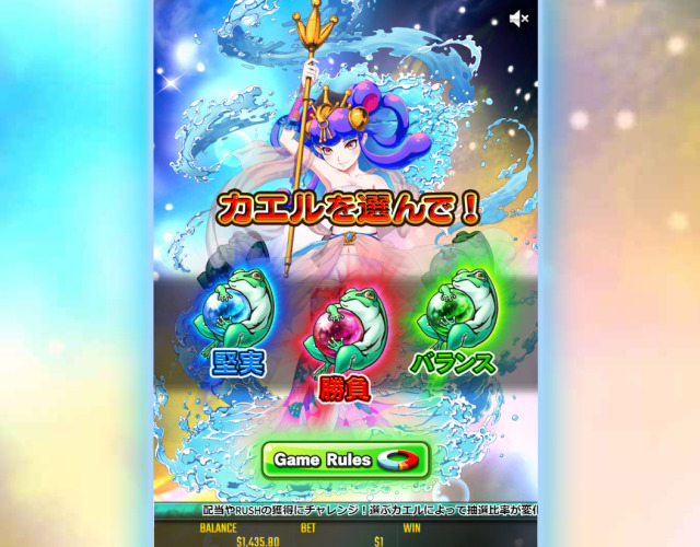 ゴッデスチャレンジはボーナスの一種であり、配当やラッシュの獲得に挑戦できます。3種類のカエルからどれを選ぶのかによって特典の抽選確率が変動します。
