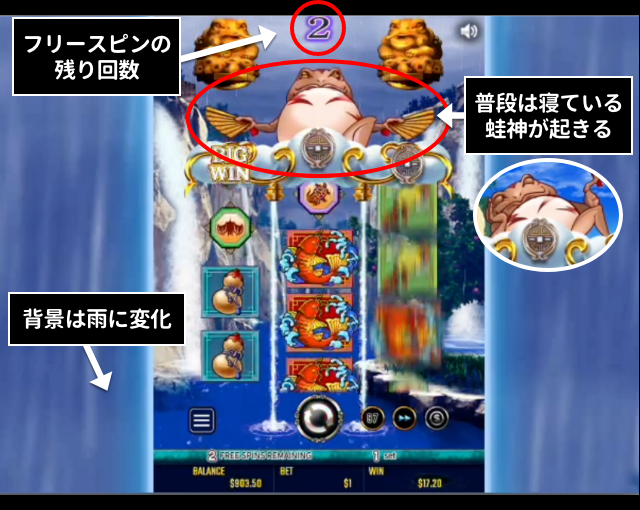 演出時は背景に雨が降り始め、スロット上部の蛙神がプレイヤーを応援してくれます。なお、フリースピンの残り回数は画面の最上へ表示されるため、残り回数がわからなくなることはありません。