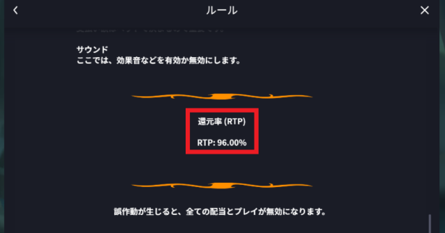 ゲームルールの説明が記載されているので、一番下までスクロールをすると還元率を確認できます。