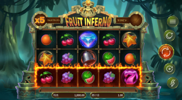 - フルーツ・インフェルノ(Fruit Inferno)はマルチプライヤーとリスピンが搭載されている
