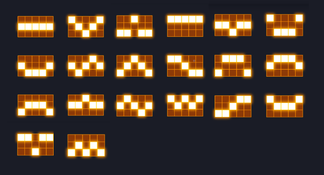 フルーツ・インフェルノのペイラインは上記の20パターンとなっており、左端から3つ以上シンボルが揃ったときにのみ配当が発生します。