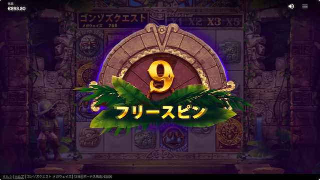 古代遺跡への道にゴンゾーが入場し、フリースピン開始です。