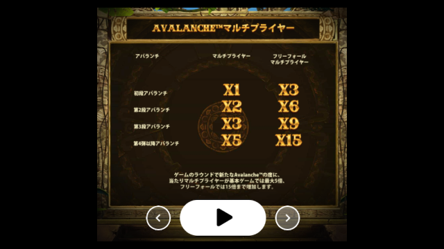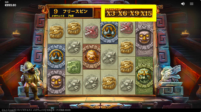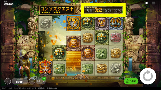 ゴンゾーズクエスト・メガウェイズのマルチプライヤーは、アバランシェマルチプライヤー呼ばれ、通常スピンなら最大5倍・フリースピンなら最大15倍まで上昇します。