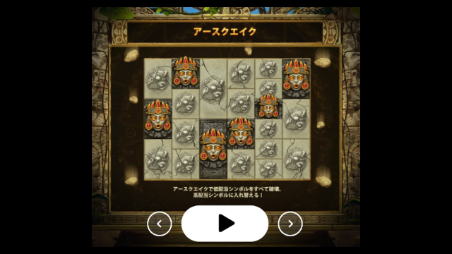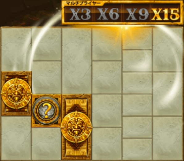 フリースピンは古代遺跡の中で行われます。右上のマルチプライヤーは『×3、×6、×9、×15』となり、連勝すればマルチプライヤーの分だけ配当が膨れ上がります。