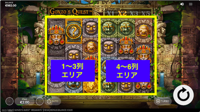ゴンゾーズクエスト・メガウェイズのワイルドシンボルは出現方法に特徴があり、1〜3列と4〜6列の2つのエリアに1つずつと決まっています。