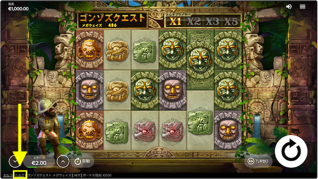ここからはゴンゾーズクエスト・メガウェイズの実際のプレイ画面を交えながら遊び方を解説していきます。