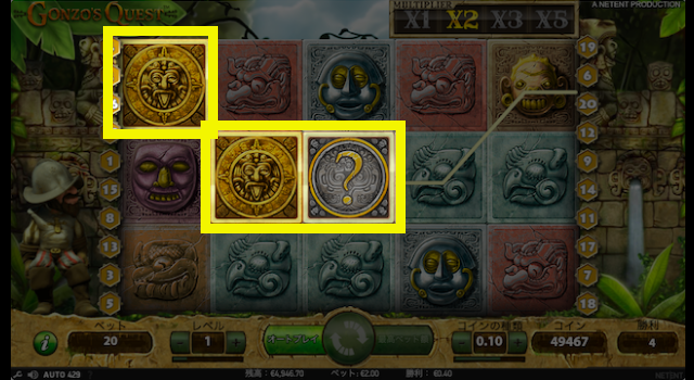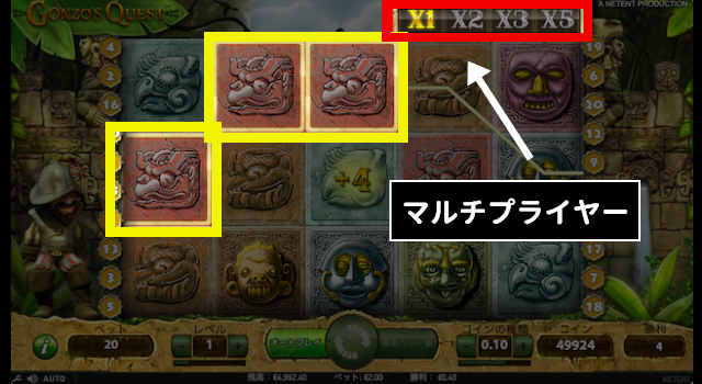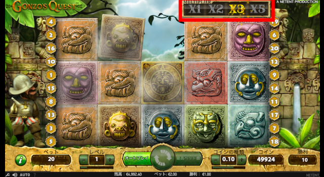 ゴンゾーズクエストのマルチプライヤーは、連続してシンボルが揃えば獲得できる配当が乗算されていくボーナス機能です。スロット画面の右上で乗算される数字が確認できます。