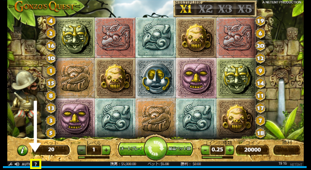 このスロットは主人公の探検家『ゴンゾー』がインカの古代遺跡を探検するというテーマで、5×3リールの20ペイラインのシンプルでわかりやすいシステムとなっています。
