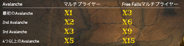 通常時のマルチプライヤーと後述するFree Falls時で倍率が変動するため下記の表を参照してください。