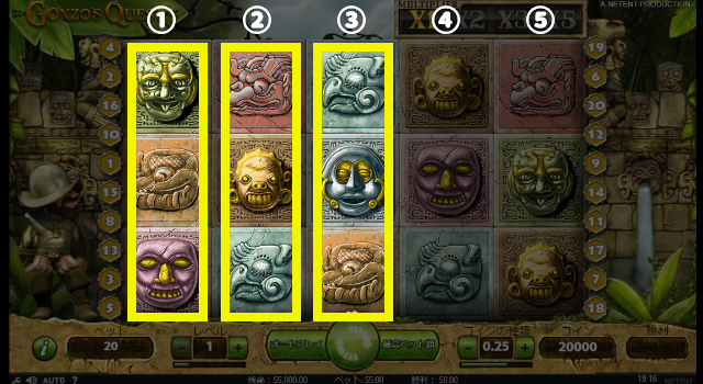 ゴンゾーズクエストのペイラインは全部で20ラインで、ペイライン上に同じシンボルが左から3個揃えば配当成立です。