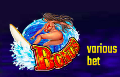 サンセットボーナスは、プレイ中に画面上に突如サーフボードで波乗りをするお姉さん(シンボル)が登場するボーナス演出です。
