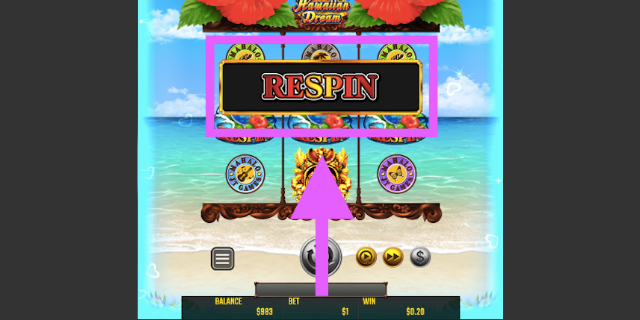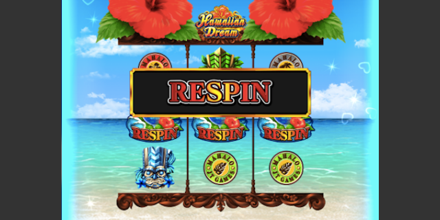 ハワイアンドリームでは、上記のリスピンシンボルがペイライン上に3つ揃うと払い戻しとは別に再度スピンできます。
