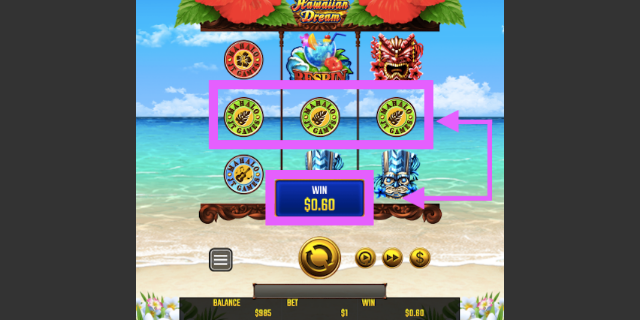 ハワイアンドリームではペイライン上に同じシンボルが3つ揃うと配当成立となります。