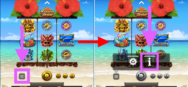ハンバーガーアイコンをタップすると『i』アイコンが表示されるので、タップして配当やルールを確認していきます。