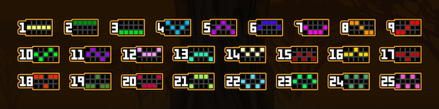メガムーラのペイラインは全部で25ラインです。いずれもスピン後に左から順に2〜3個以上のシンボルが揃うことで配当成立します。