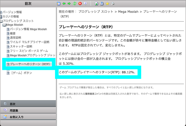 ヘルプマークをクリックすると以下の画面が表示され、『プレイヤーへのリターン(RTP)』にてチェックできます。