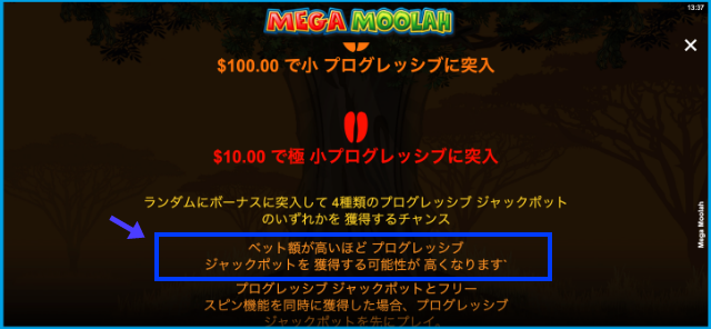 メガムーラ内のルール説明には、ベット額が高くなるほどジャックポット当選の可能性が高くなると記載されています。