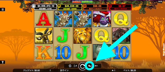 ベット額は$0.25〜$6.25まで調整可能なので、ベットサイズと書かれている直下のスライダーで操作するか、その下のベット額のボタンをクリックして一括変更できます。
