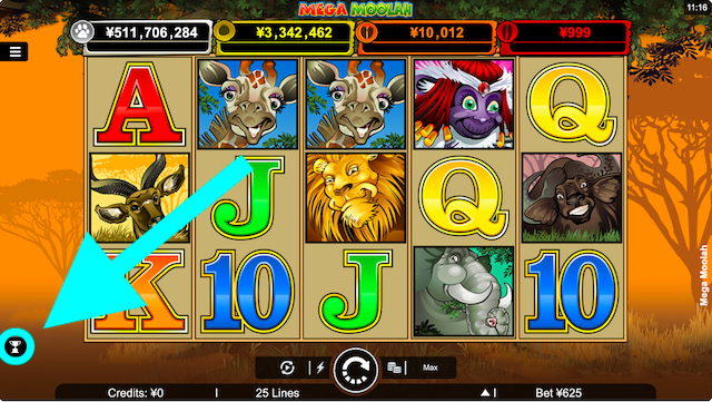 メガムーラでは過去のジャックポット当選者の履歴が確認可能で、画面左下のトロフィーボタンから見ることができます。