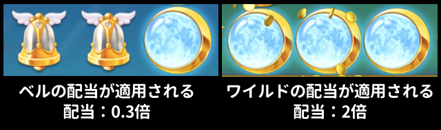 例えば以下の画像の場合、左側の『シンボル+ワイルド』ではベルの配当金額が払い戻しされます。