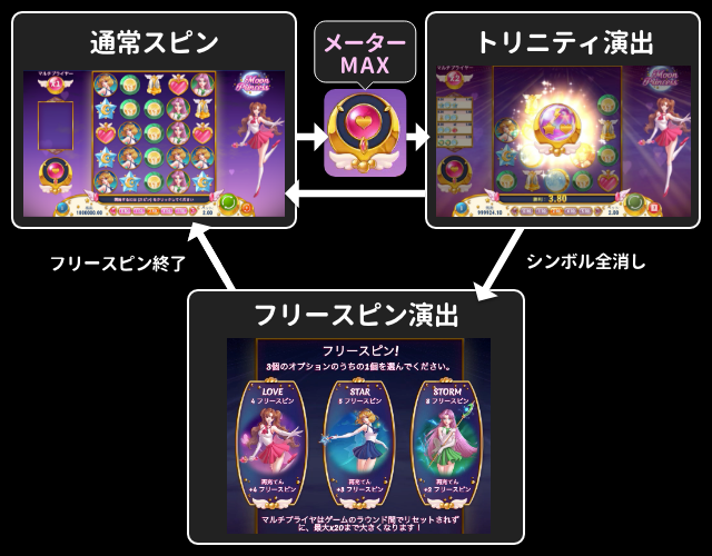 トリニティメーターは、通常スピンでプリンセスのシンボルが揃うことによってメーターが貯まります。