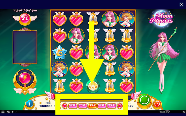 まず、ムーンプリンセスを起動したら好みのベット額を設定します。ベット額はプレイ画面最下部で設定可能です。