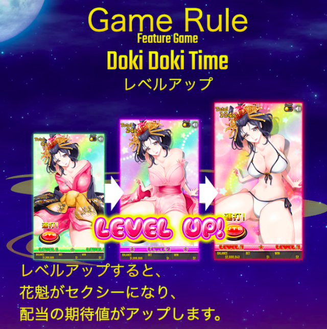 リスピン・花魁RUSH・家紋ボーナス・DokiDokiTimeと機能満載で、遊郭の花魁を落とす時の駆け引きのように楽しめるので、この機会に是非遊んでみてください。