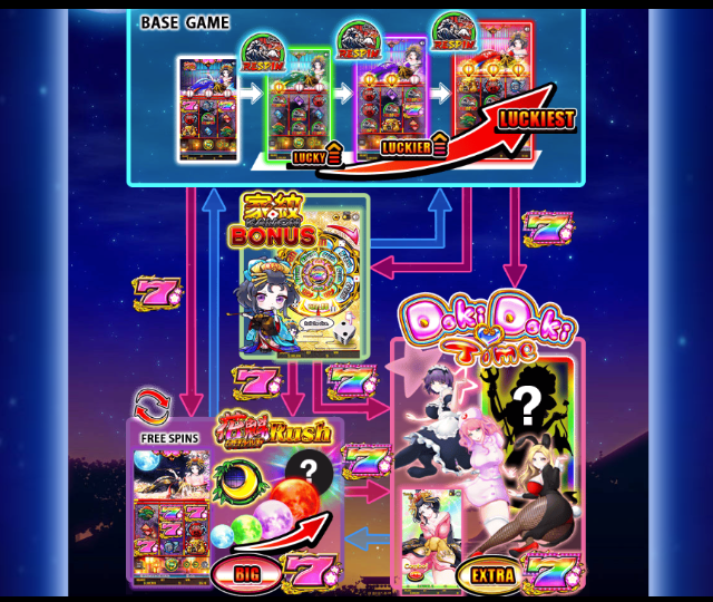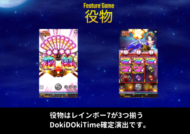 DokiDokiTimeは、レインボー7シンボルが3個出現すると発動するフューチャーモードです。継続率が衣装ごとに変化するユニークなモードで、イメージとしては花魁RUSHに突入する前に、花魁との遊郭遊びが堪能できる少しアダルティな演出です。