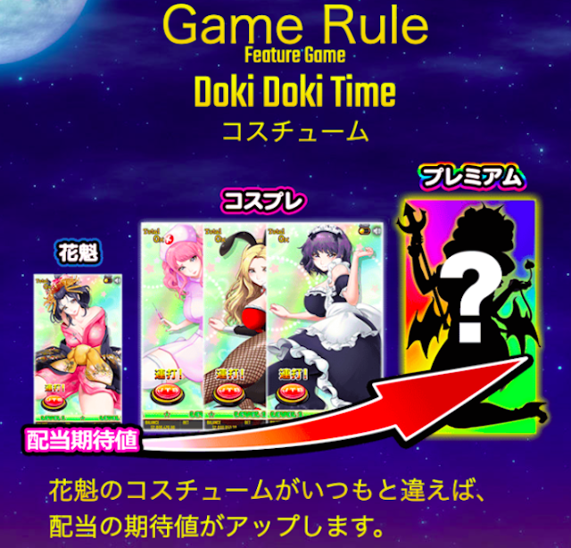 そして、歌モードからDokiDokiTimeに突入した場合は花魁がコスプレ以上になることが確定しており、最上位のサキュパスに当選する確率もUPします。