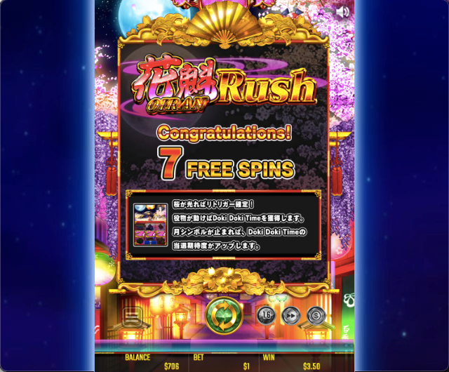 DokiDokiTimeが終了し、配当確定後はフリースピンの花魁RUSHへ突入します。
