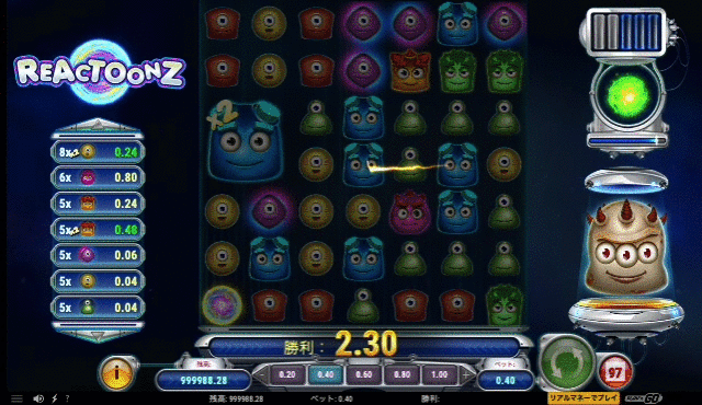 リアクトゥーンズ(Reactoonz)は、連鎖でゲージが貯めて様々なフィーチャーを引き、最終的に『GARGANTOON』という爆発力のある上位フィーチャーを狙うスロットです。