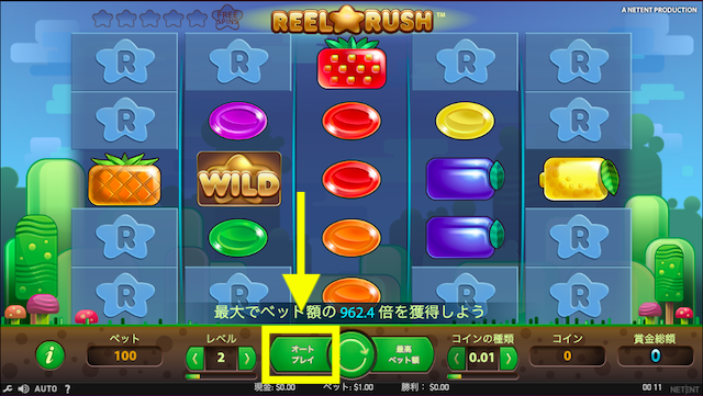 ちなみに、リール・ラッシュにはスピンボタンを何度もクリックせずに自動でスピンできる『オートプレイ』設定も可能です。