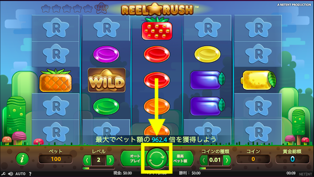 賭け金額が設定できたら、画面最下部にあるスピンボタンを押してゲームスタートです。