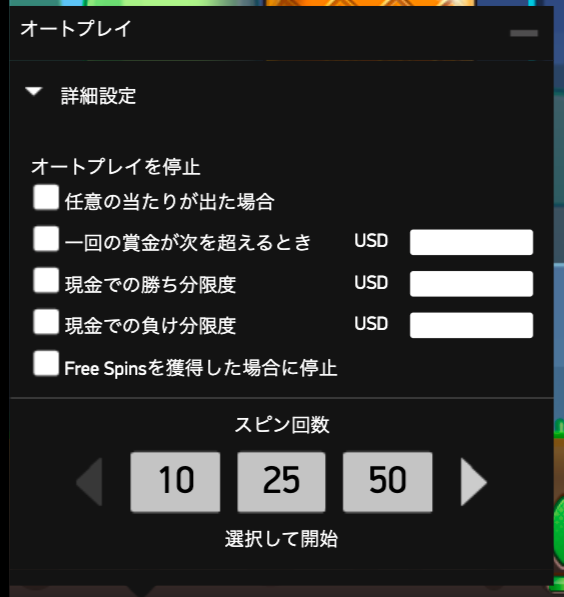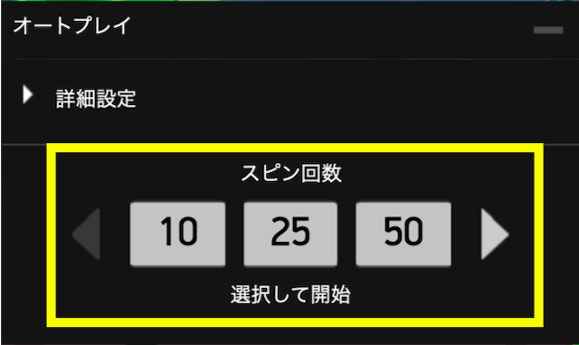 オートプレイをクリックすると、プレイ画面左下に以下のような画面が表示されるので、スピン回数を設定しましょう。