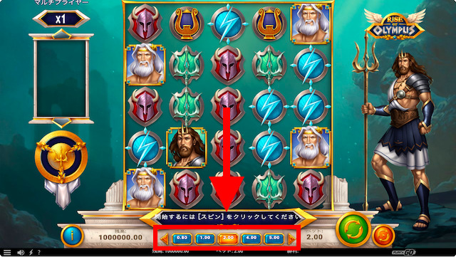 まず、ライズ・オブ・オリンパスを起動したら好みのベット額を設定します。ベット額はプレイ画面最下部で設定可能です。