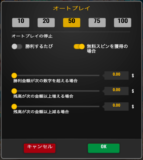 プレイ画面右下の『▶︎』ボタンではオートスピンの設定が可能で、スピン回数に加えて以下のような詳細な停止条件も設定できます。