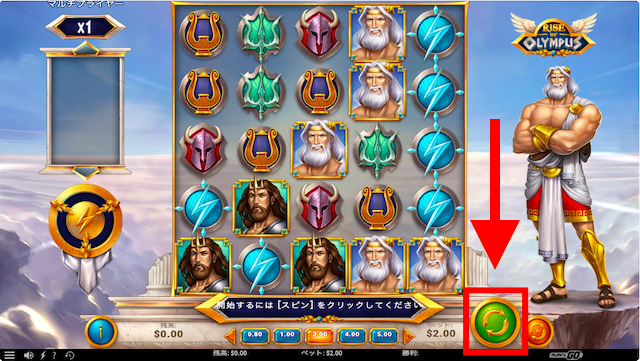 全ての設定が完了したら、プレイ画面右下にある緑色のスピンボタンを押してゲーム開始です。