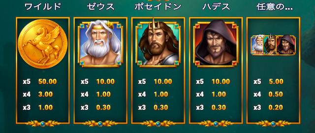この中にある『任意のシンボル』というのは、高配当の神々シンボル(ゼウス・ポセイドン・ハデス)が複数種類混ざって揃った場合の配当倍率です。