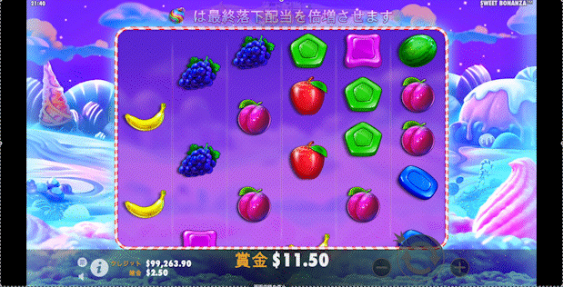 配当は自動計算なので細かく覚える必要はありませんが、どのシンボルが高配当なのか覚えておくとゲームをより楽しみやすくなります。キャンディー系のシンボルは高配当、フルーツ系シンボルは低配当と覚えておくと分かりやすいです。
