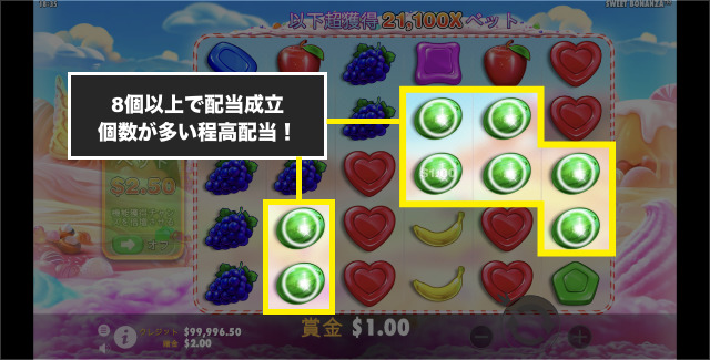 スイートボナンザは落ちゲータイプのスロットなので、特定のペイラインはありません。同一シンボルがリール上に8個以上出現すれば配当成立です。