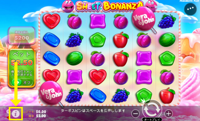 スイートボナンザベラジョンの還元率は、ゲーム画面左下の『i』アイコンから確認できます。