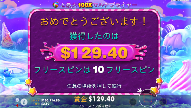 スイートボナンザで高配当を獲得するためには、フリースピンに突入できるかどうかが鍵になります。リール上にスキャッタ―シンボルが4個以上出現すると10回のフリースピン獲得となり、下記の画面が出てきます。