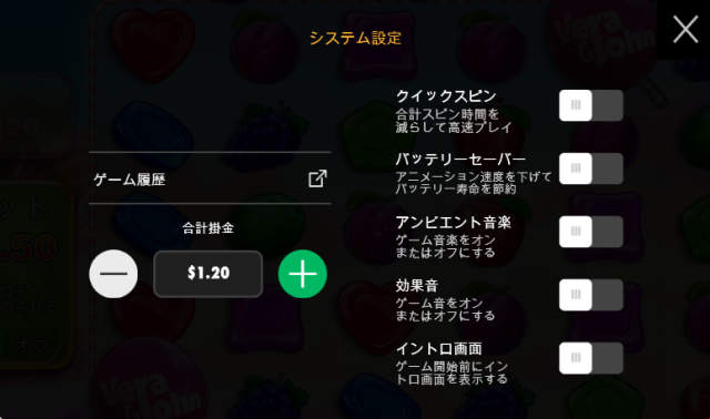 スイートボナンザベラジョンでは、サウンドのON/OFFやバッテリーセーバーなどの設定を変更できます。