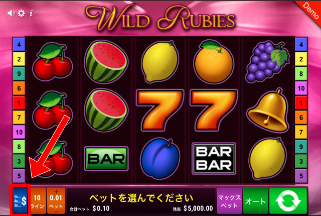 ワイルド・ルビーズのゲーム画面を開いたら、まずはベット額の設定から行います。
