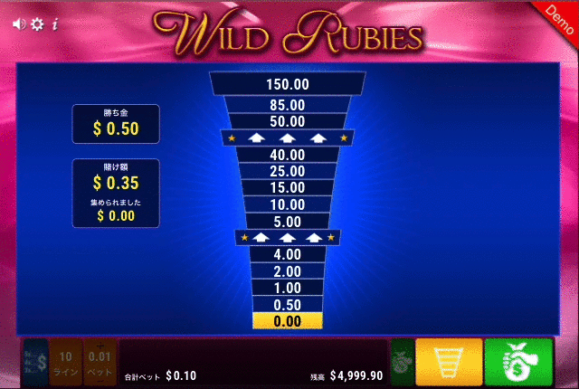 なお、ワイルドシンボル自体にも配当が設定されているため、左端からルビーシンボルが3つ以上揃えば通常シンボル同様配当が発生します。