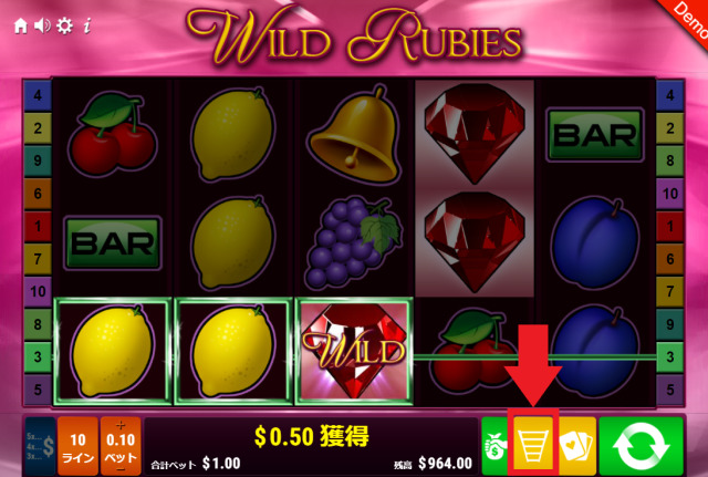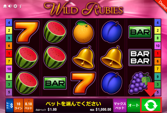 $0.01~$10の間で設定できますが、あくまでも設定しているのは1ペイラインあたりのベット額です。ワイルド・ルビーズのペイラインは10で固定のため、設定したベット額×10が合計ベット額になります。