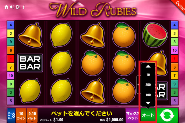ワイルド・ルビーズにはオートスピンの機能があり、10回/100回/250回のいずれかを選択できます。