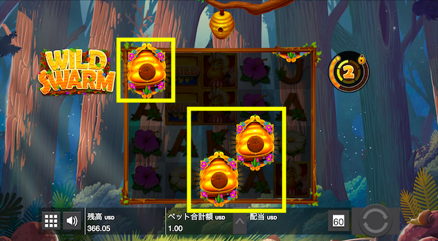 スピン開始前に、大量の蜂の群れがスロット上にネバネバワイルドシンボルをランダムで配置してくれます。